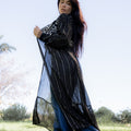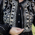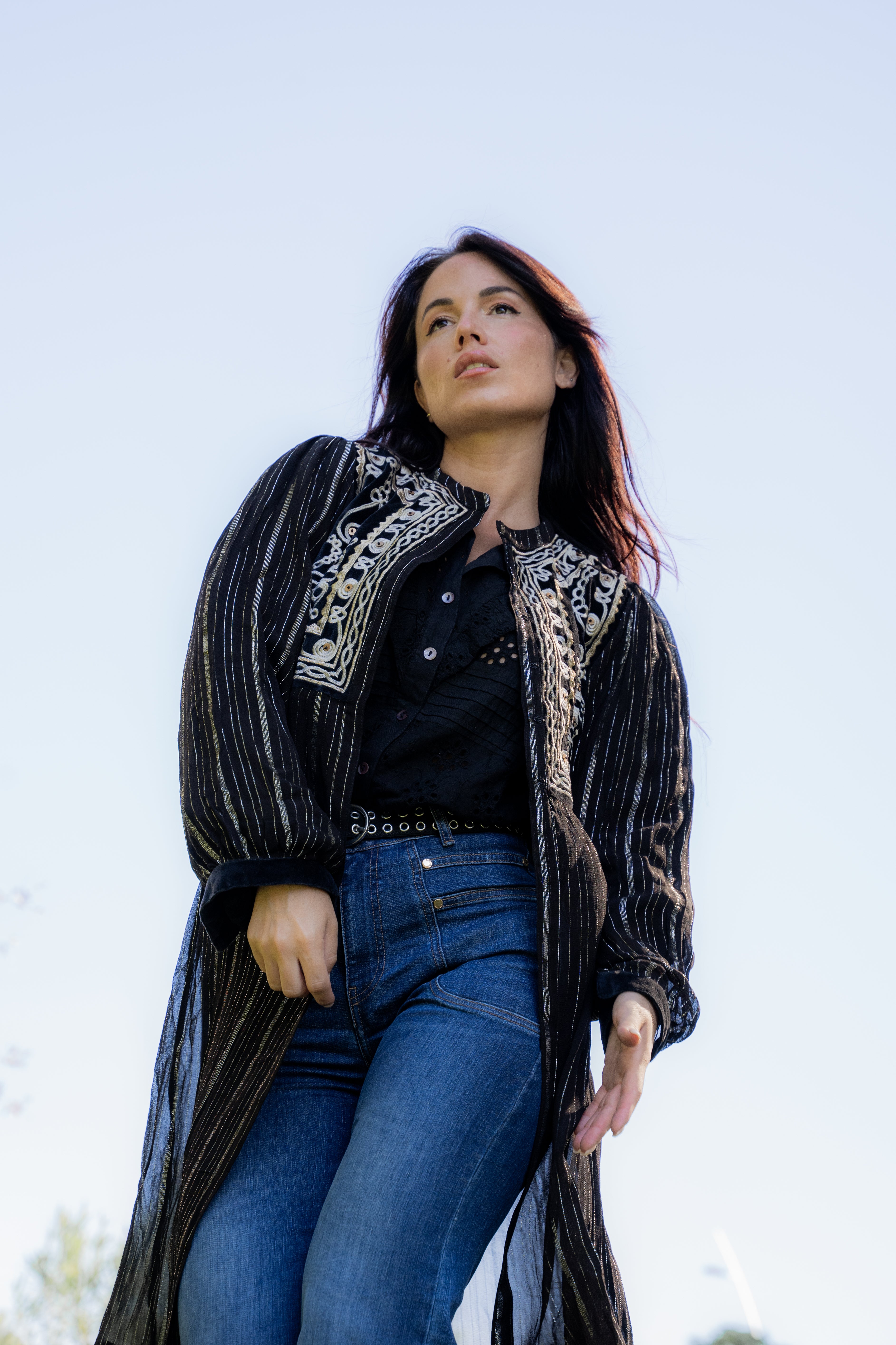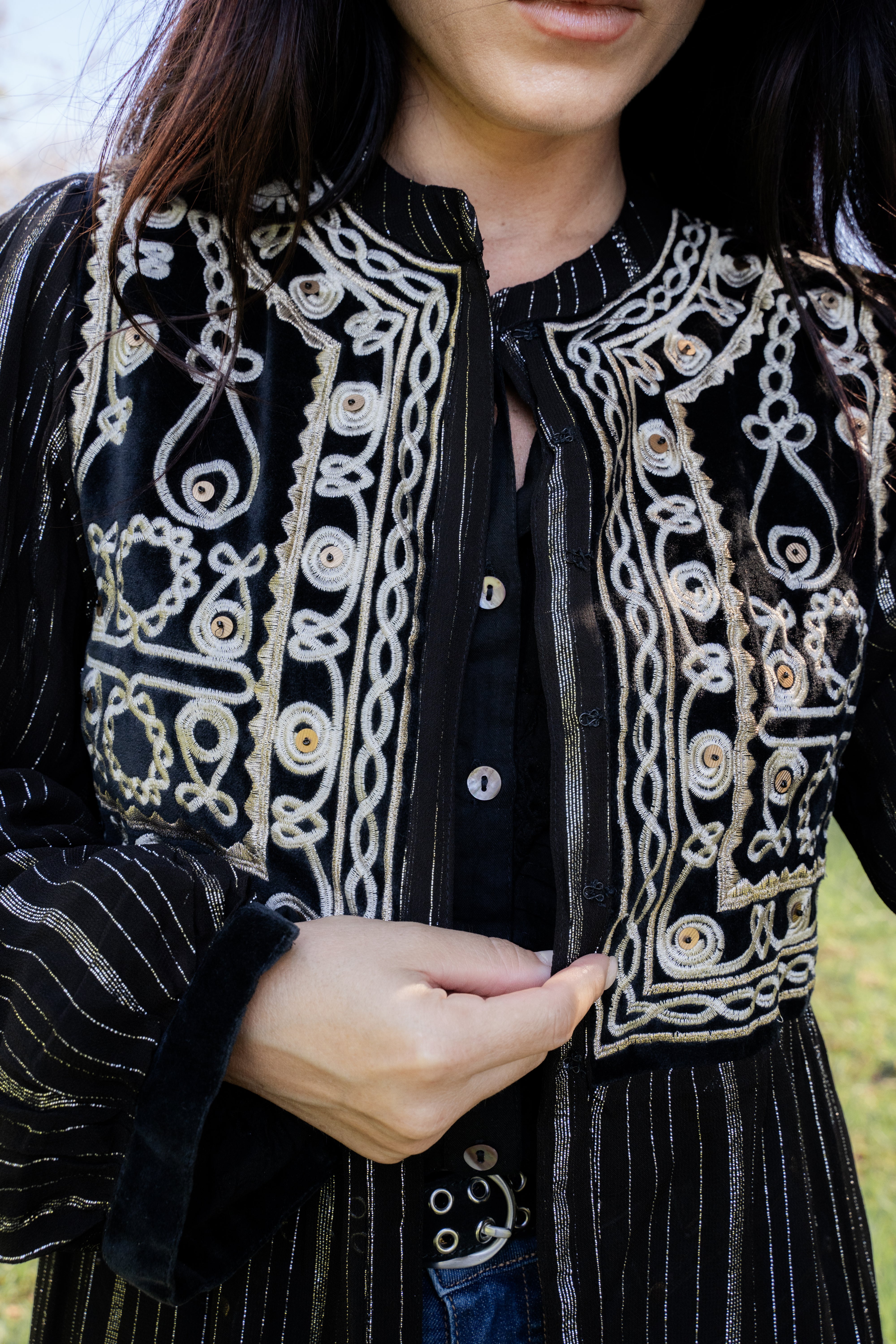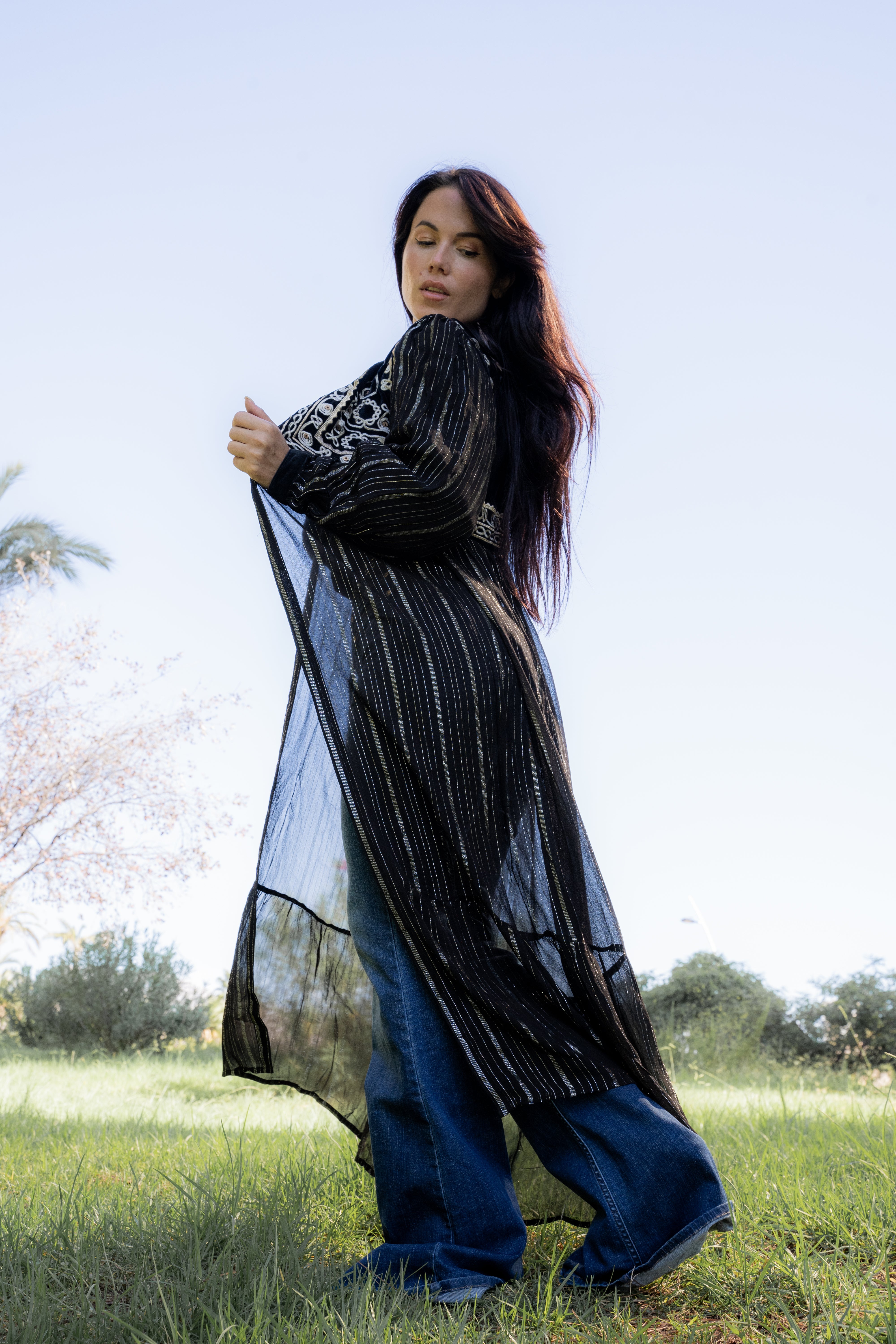Descubre la Chaqueta Boho Imperial , una pieza única con aires bohemios y bordados artesanales que elevan a cualquiera con su look . Su diseño largo con detalles dorados y plateados en la parte superior aporta un toque elegante y versátil , ideal para combinar con vaqueros , pantalones ajustados o vestidos fluidos.