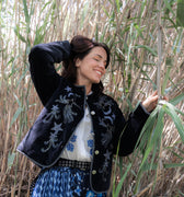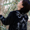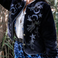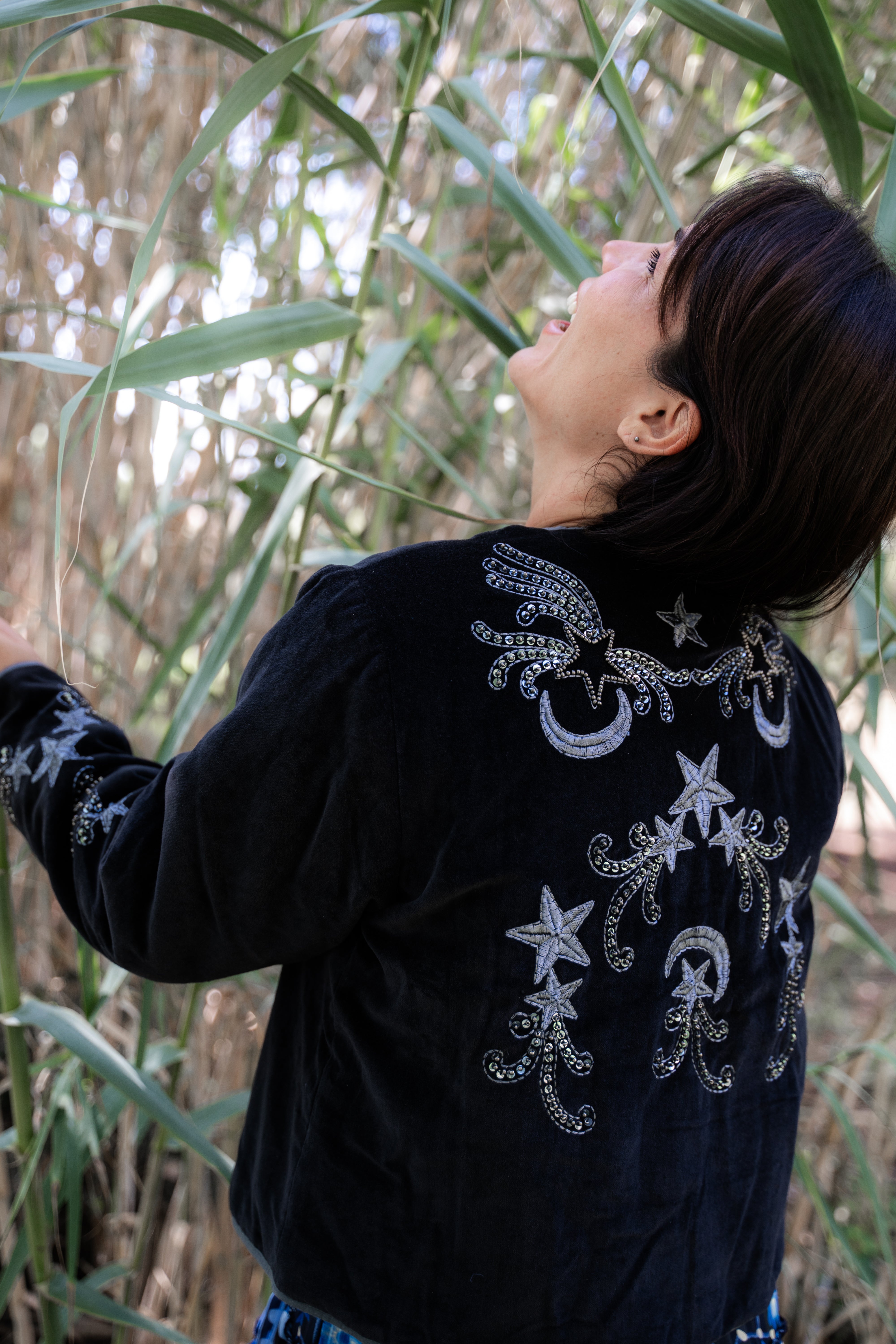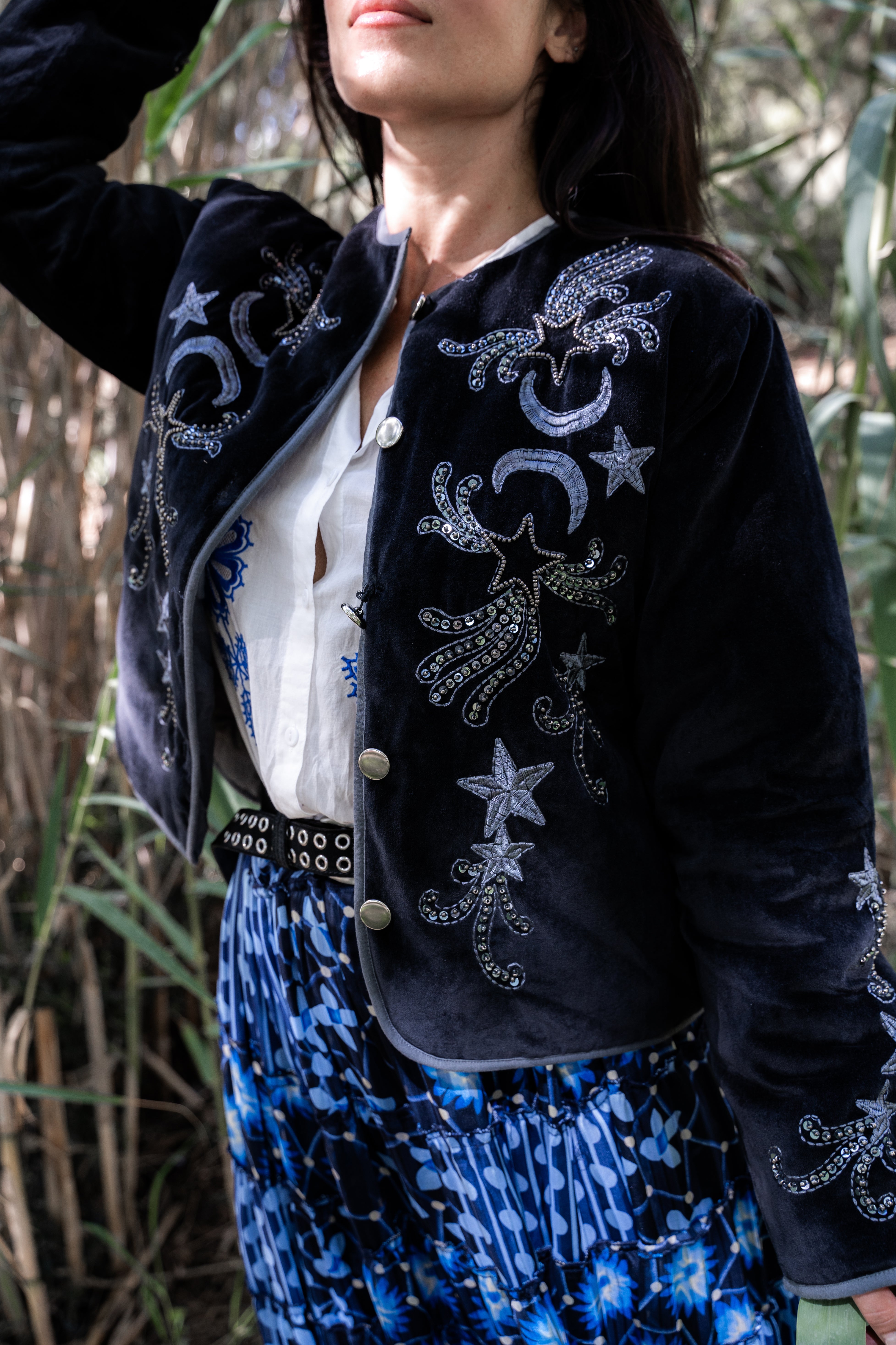 Brilla con la Chaqueta Galaxy Velvet , una prenda única que combina la elegancia del terciopelo negro con espectaculares bordados de estrellas , lunas y6 detalles florales. Diseñada para mujeres con estilo propio , esta chaqueta boho-chic es perfecta para elevar cualquier oufit , ya sea casual o para una ocasión especial.