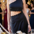 Este vestido negro de encaje y satén eleva el concepto de sofisticación con un giro inesperado: una apertura sutil en la cadera que insinúa sin mostrar demasiado.
