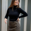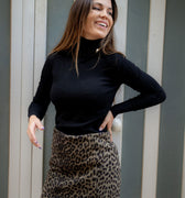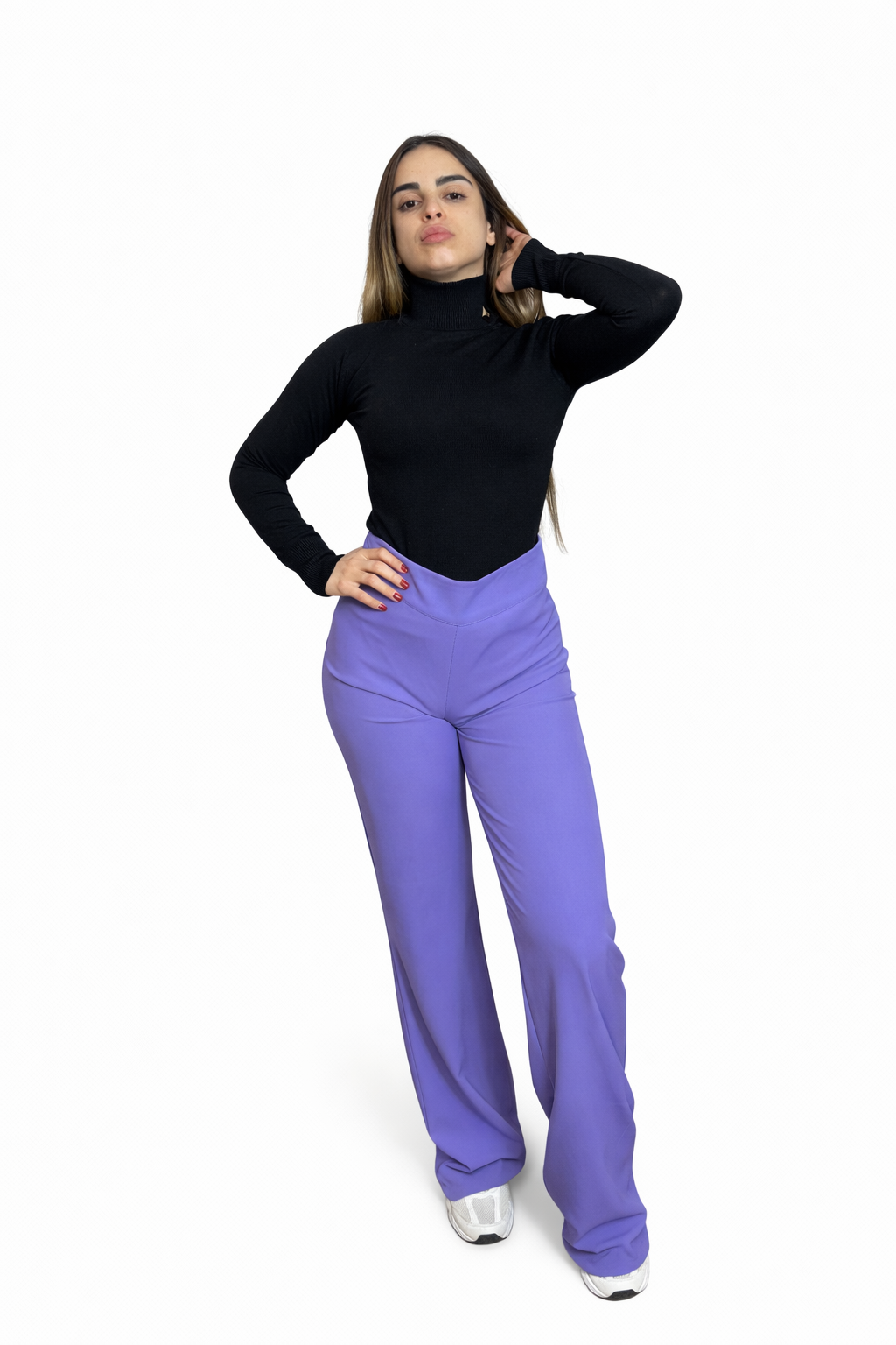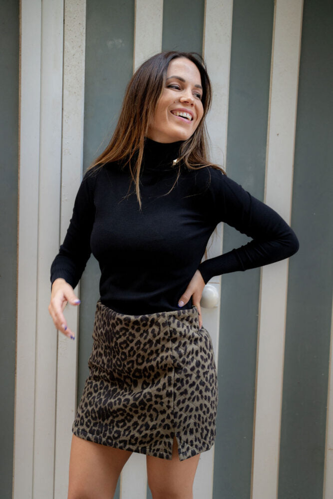 Este jersey es de punto fino, negro tiene cuello alto vuelto con detalle de aplique metálico en forma de pirámide, lo que le da un toque moderno y elegante. Las mangas son largas y el acabado en puños y bajo es de canalé, aportando comodidad y un ajuste más favorecedor.