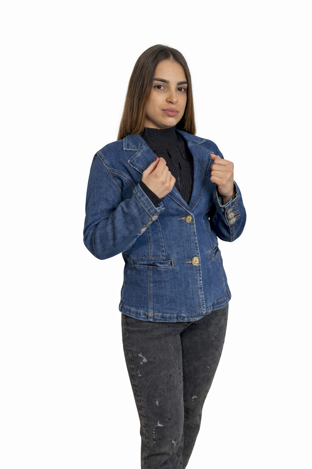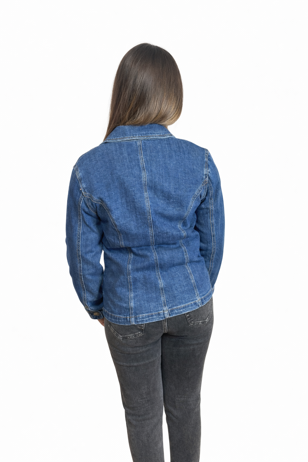 Añade un toque sofisticado a tus looks casuales con esta chaqueta vaquera tipo blazer.