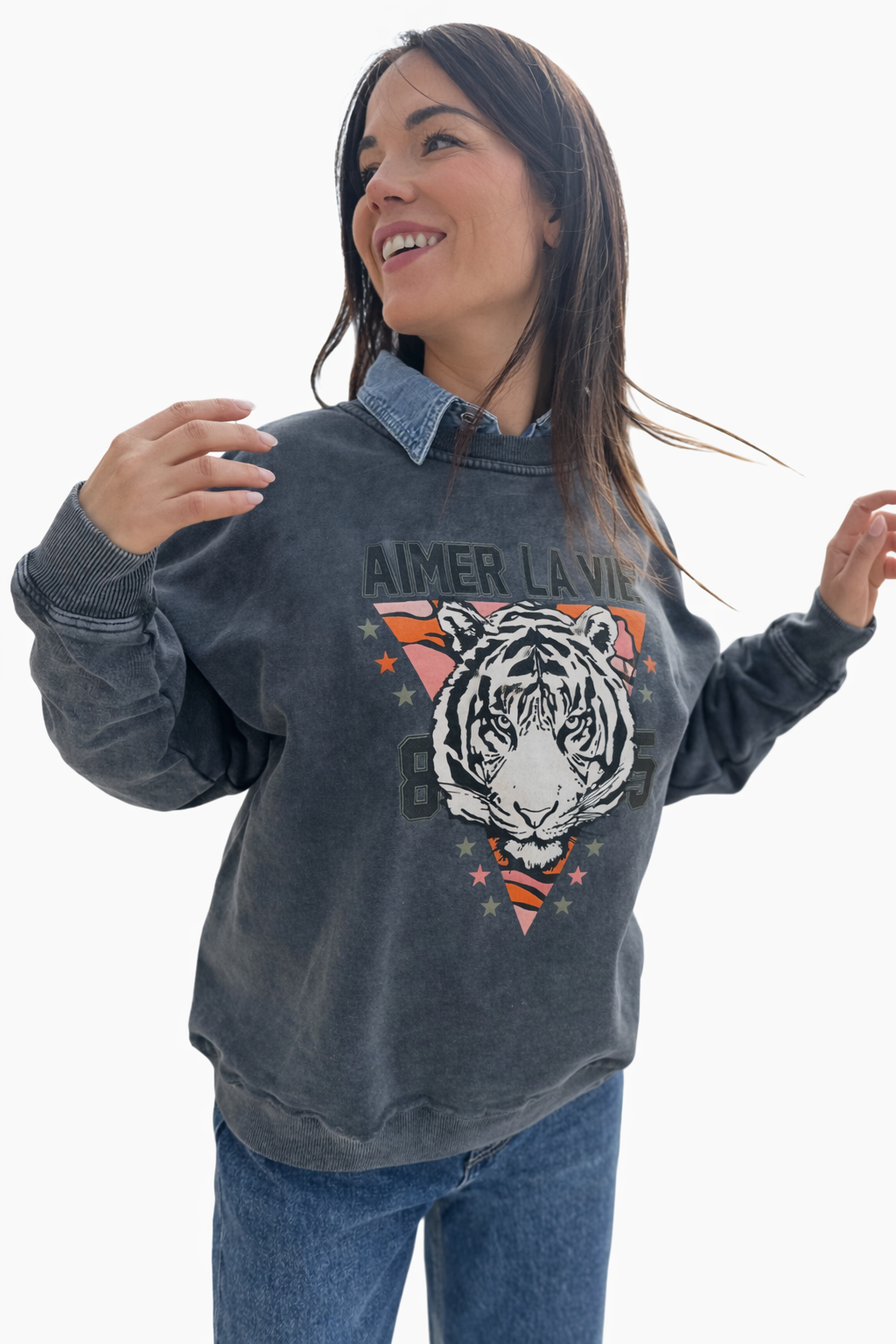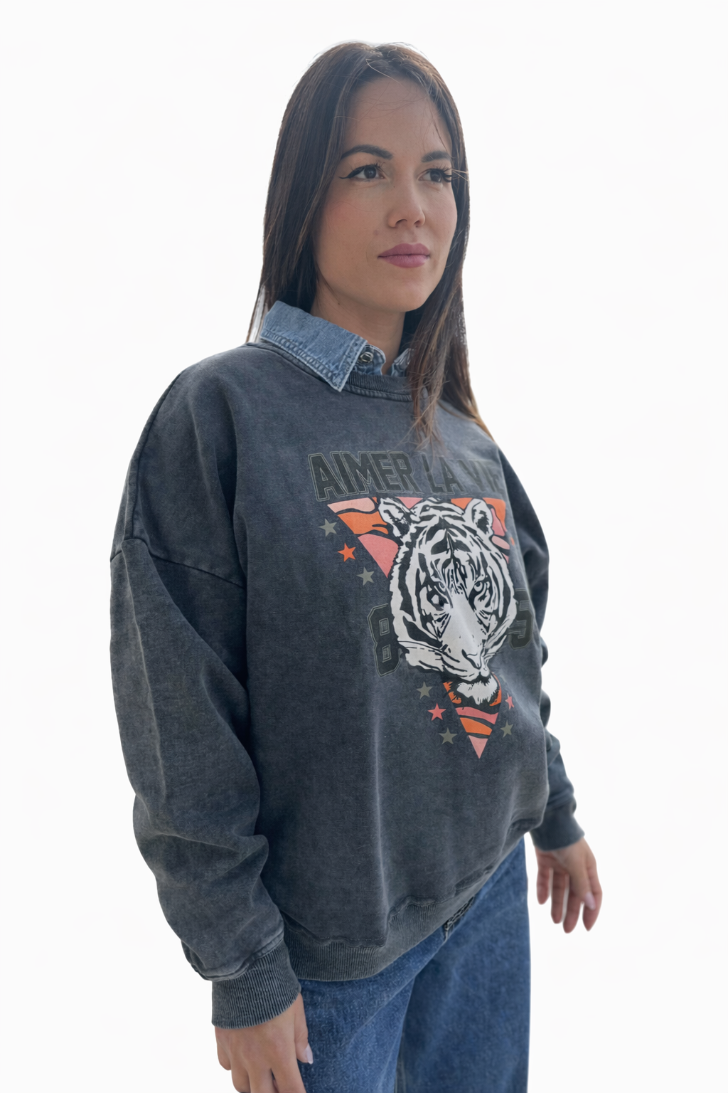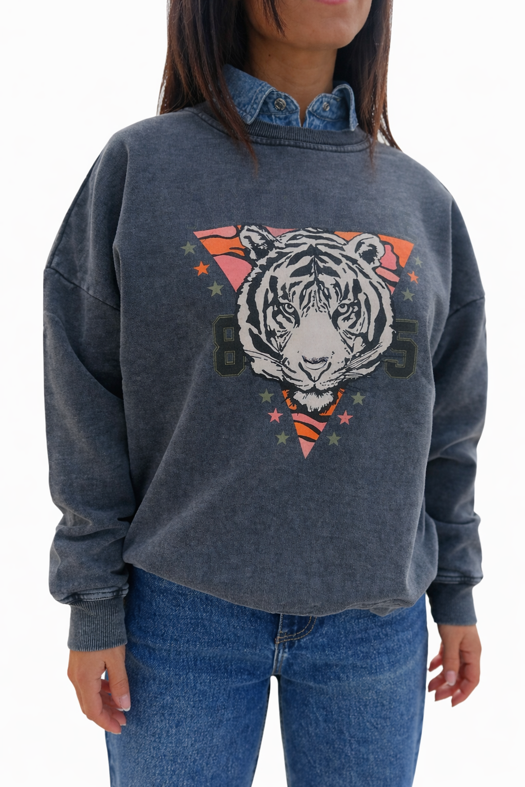 Sudadera de estilo oversize con efecto lavado vintage y potente estampado frontal de tigre, ideal para looks casuales con personalidad.