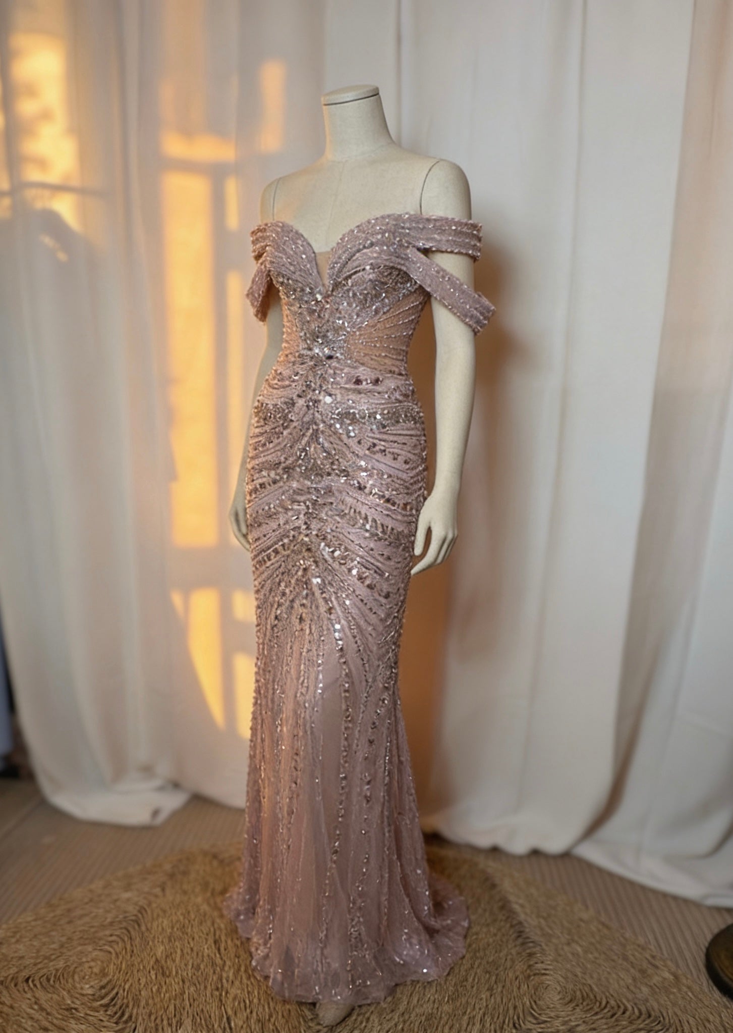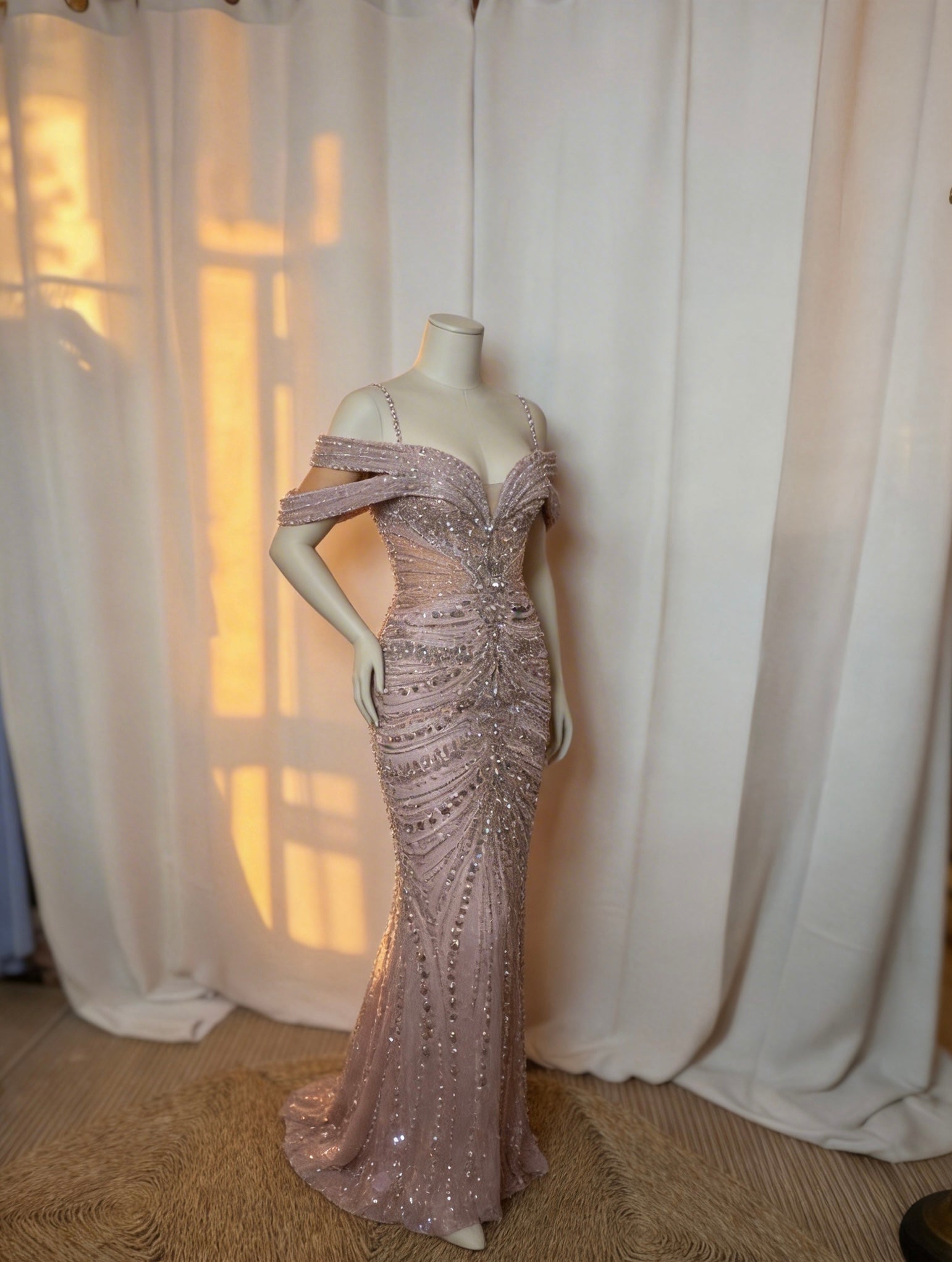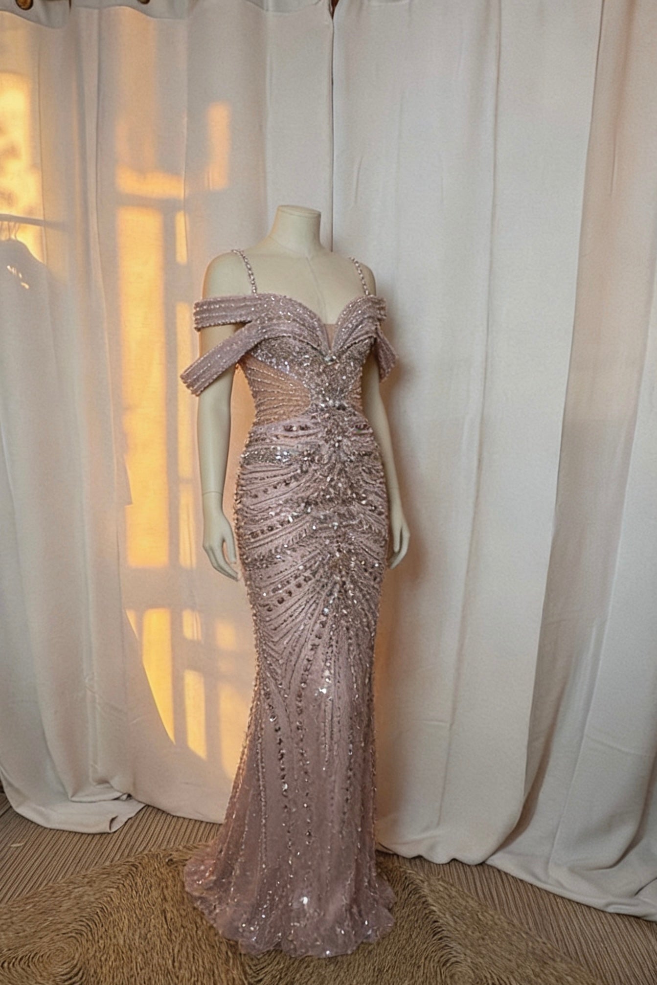 Vestido largo de noche en tono rosa empolvado, con silueta sirena que estiliza la figura y pedrería bordada que aporta un brillo elegante y sofisticado. El escote corazón con mangas caídas crea un efecto femenino y favorecedor, ideal para bodas de noche, galas y eventos especiales.