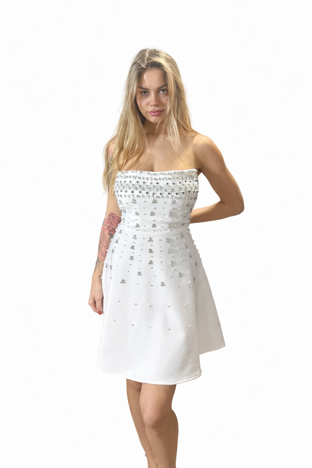 El vestido Crystal Aura es una pieza corta y sofisticada diseñada para brillar en cualquier ocasión especial. Con un favorecedor escote palabra de honor, su cuerpo está adornado con delicadas aplicaciones de cristales y pequeñas perlas que se dispersan suavemente hacia la falda, creando un efecto degradado luminoso y muy elegante. Su silueta en línea A estiliza la figura y aporta un toque moderno, refinado y femenino. Perfecto para eventos de noche, fiestas exclusivas o momentos en los que quieras destacar con un look radiante y atemporal.