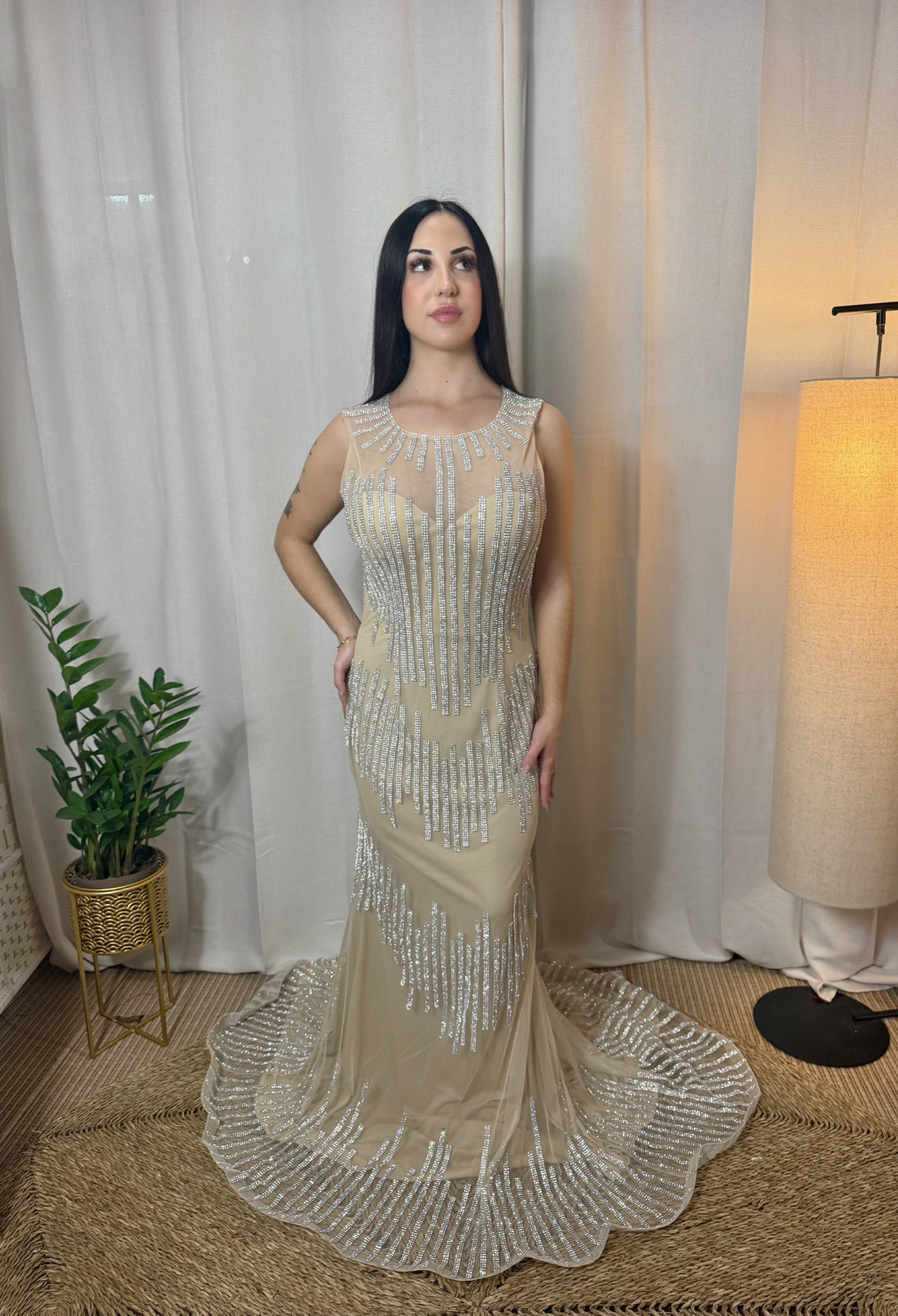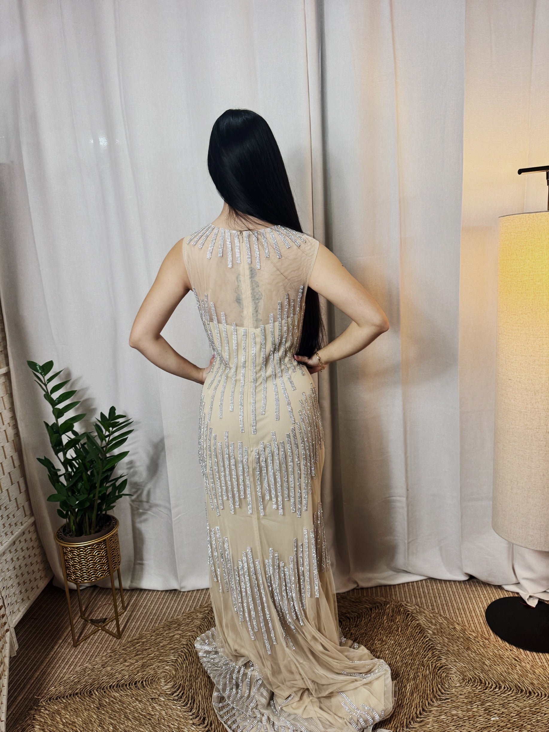 El Vestido Gala Aurora es un diseño largo de inspiración gala, confeccionado en tul nude con delicado bordado de pedrería plateada que crea un sofisticado efecto segunda piel. Sus líneas verticales estilizan la figura y aportan un brillo elegante y equilibrado, ideal para eventos especiales.
