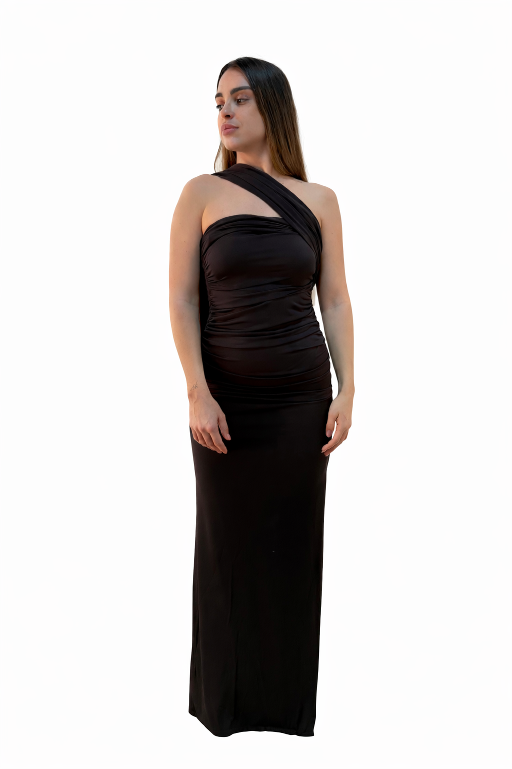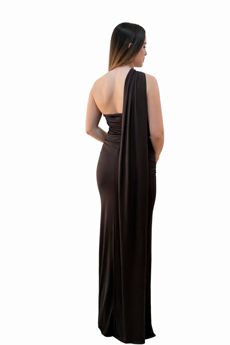 Este vestido largo en tono chocolate es la alternativa sofisticada al negro clásico. Su corte asimétrico con hombro descubierto realza la silueta, estiliza el torso y aporta un aire moderno y exclusivo.