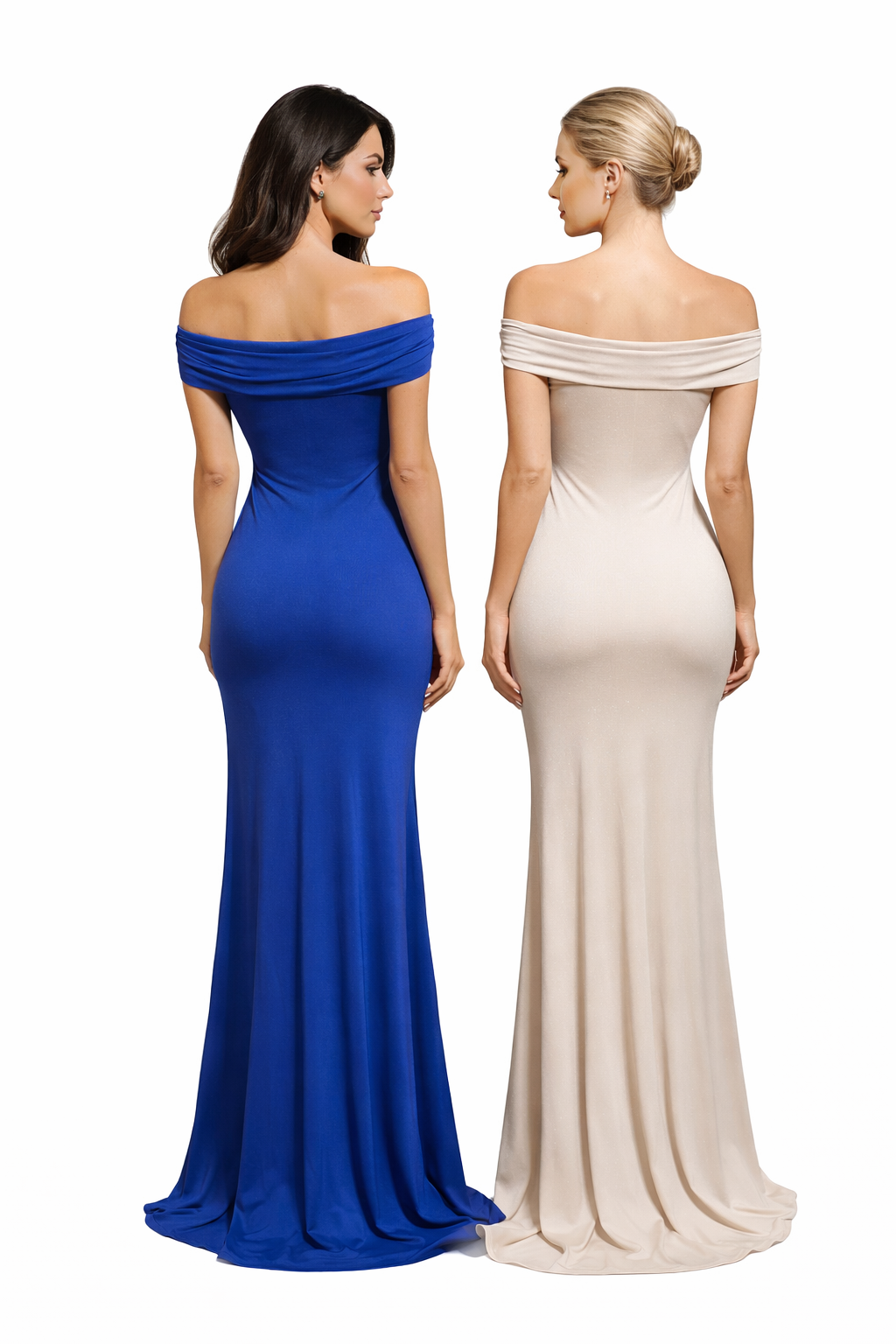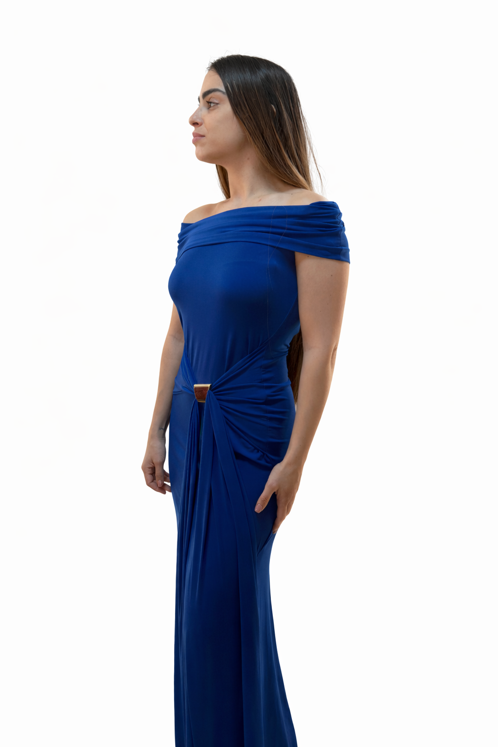 Su escote bardot realza los hombros con delicadeza, mientras que el drapeado frontal estiliza la figura y crea una silueta femenina y sofisticada. El tejido elástico se adapta al cuerpo con comodidad, abrazando las curvas sin oprimir y permitiéndote moverte con libertad durante todo el evento.