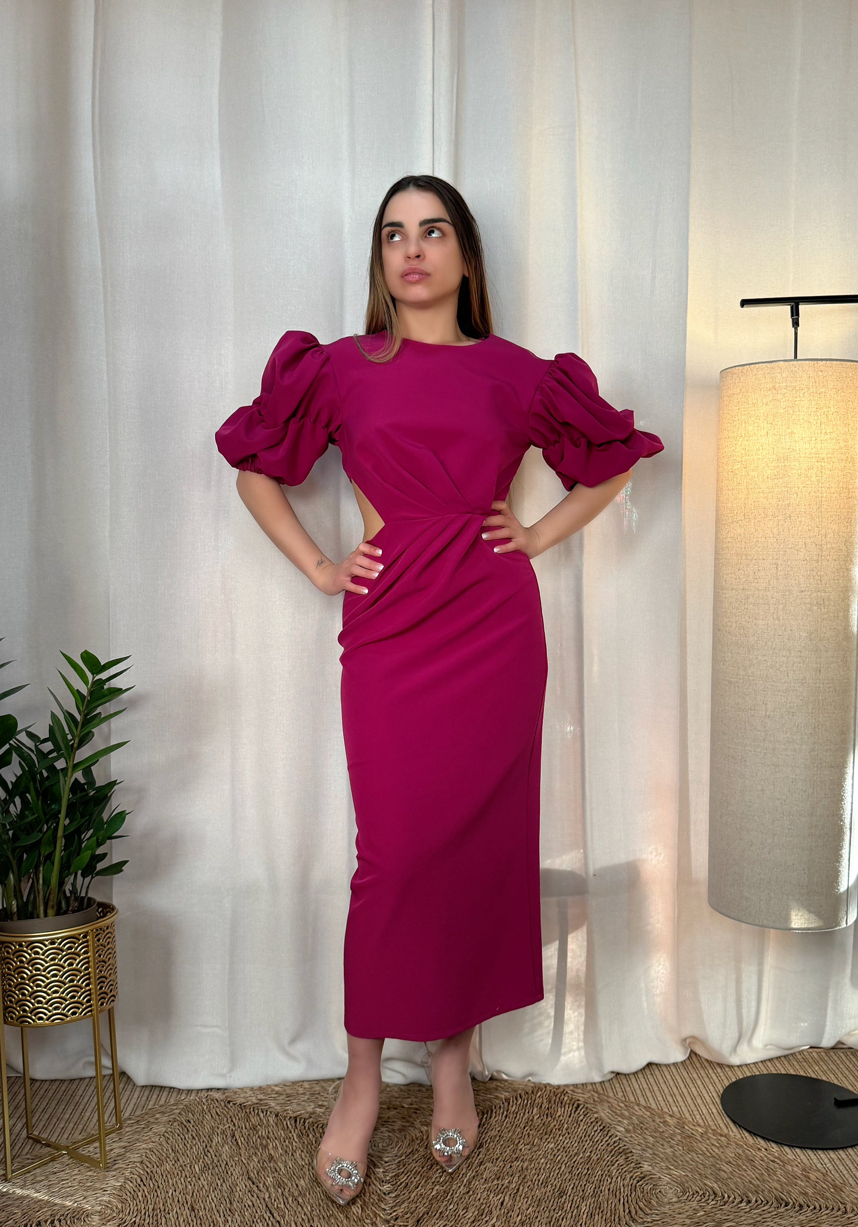 Un vestido que no pasa desapercibido. El Buganvilla Imperial envuelve la silueta con un color vibrante y sofisticado que transmite fuerza, feminidad y elegancia. Sus mangas abullonadas aportan presencia y estilo, mientras que el drapeado central en la cintura estiliza visualmente el cuerpo, realzando las curvas con sutileza.