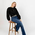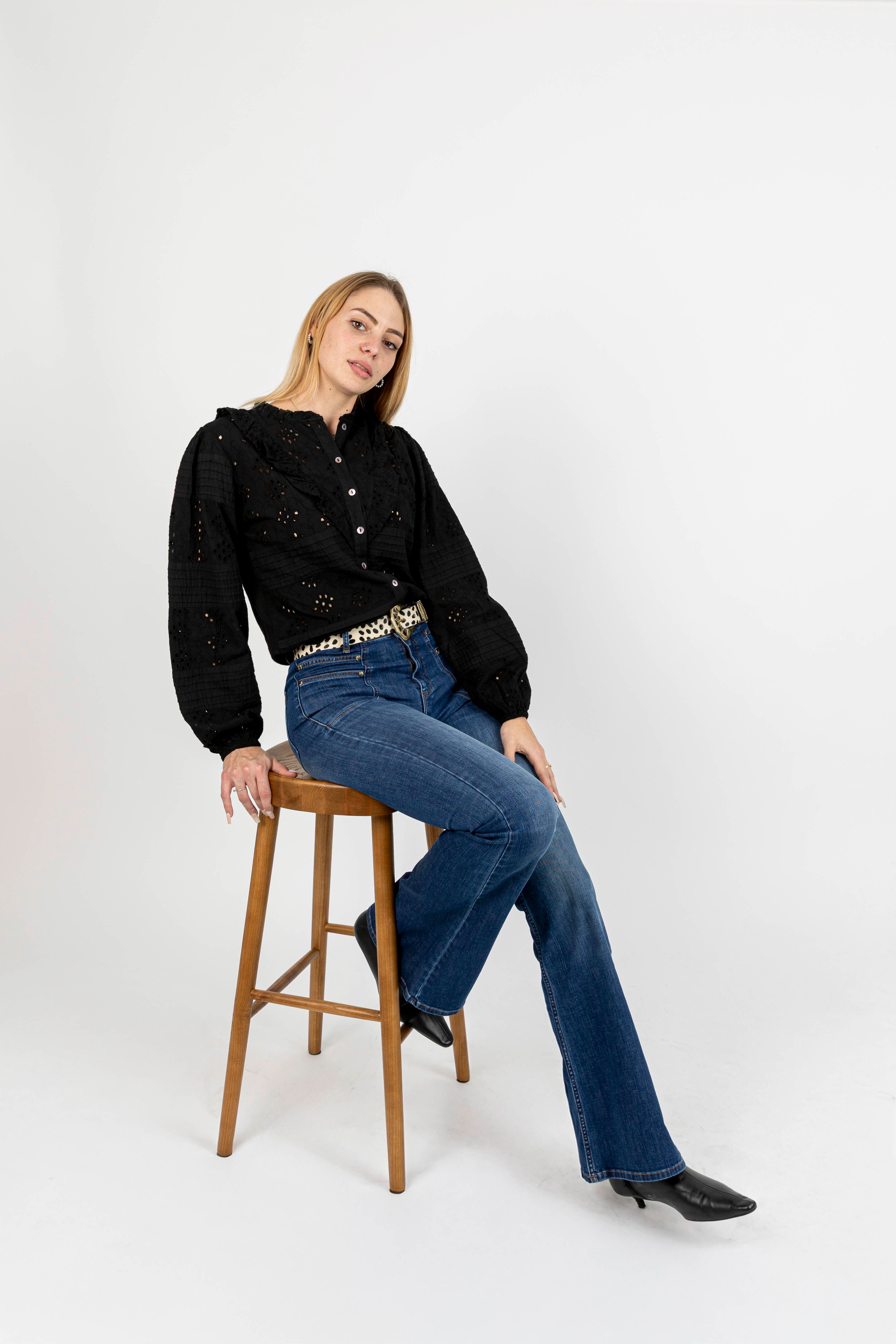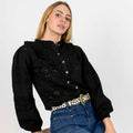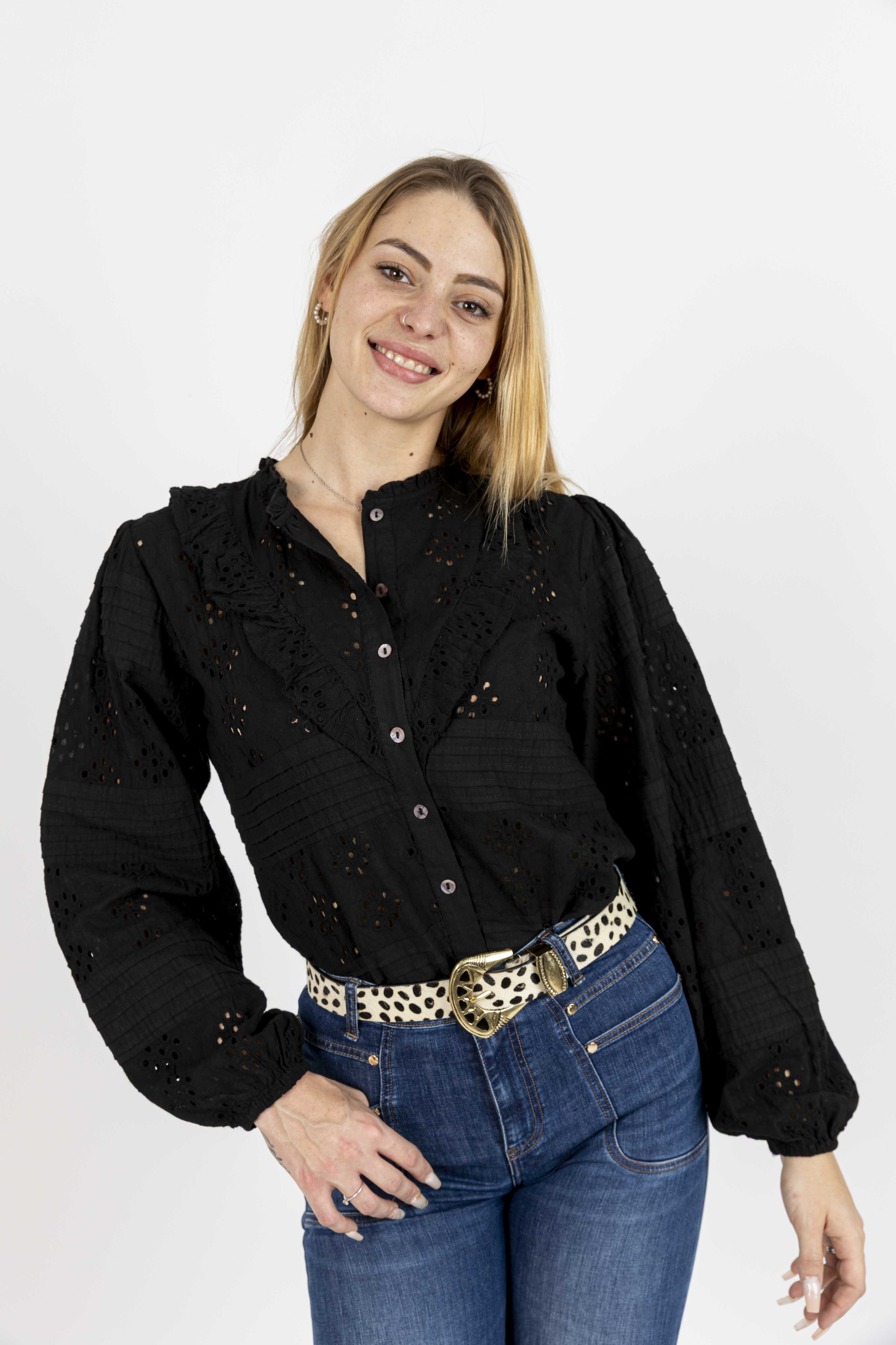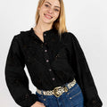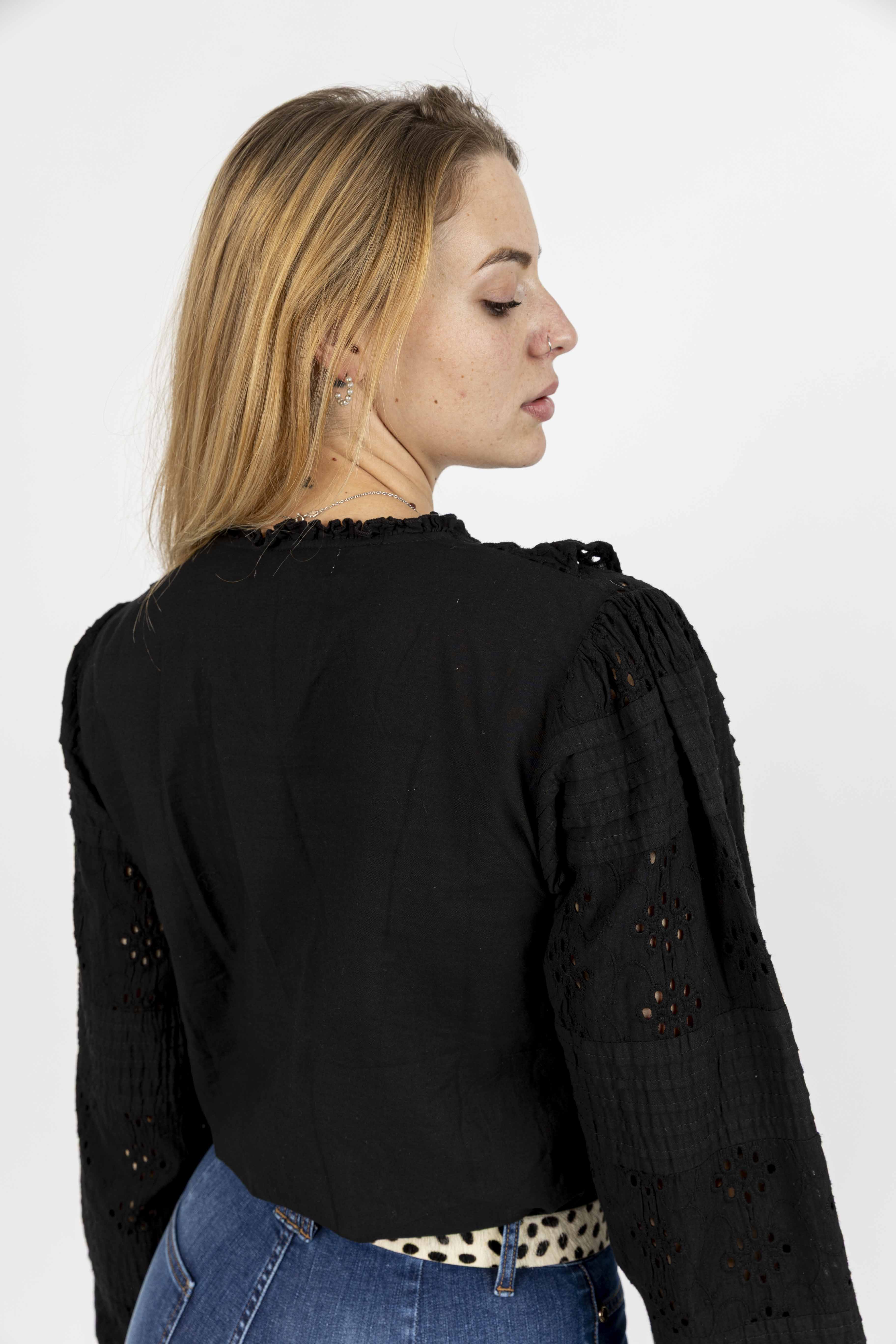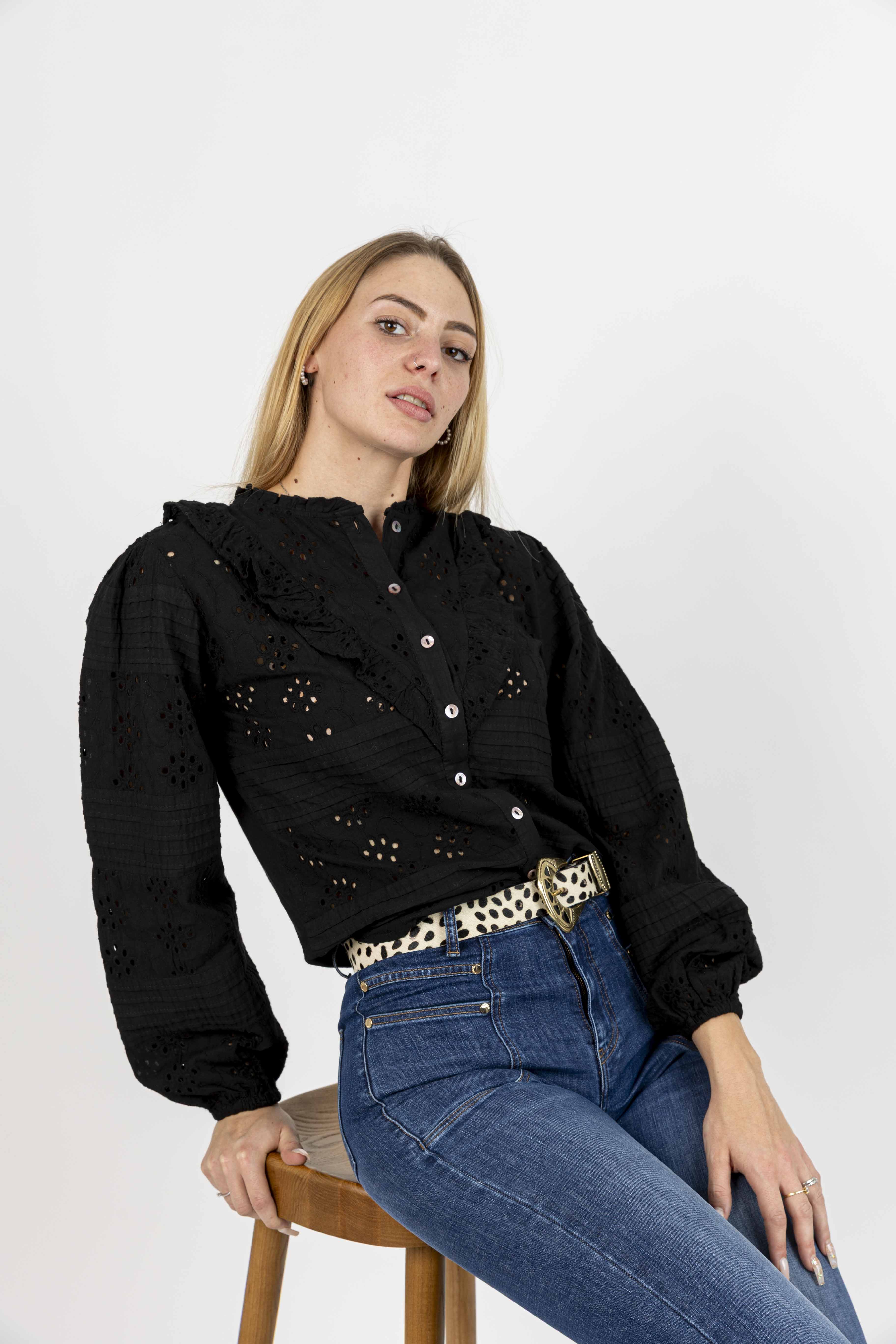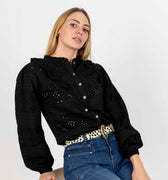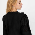 Eleva tu estilo con esta blusa negra de encaje bordado estilo romántico, una prenda versátil y atemporal que no puede faltar en tu armario. Confeccionada en tejido ligero tipo broderie anglaise, presenta delicados calados florales, volantes en el pecho y mangas largas ligeramente abullonadas que aportan un aire femenino y sofisticado.